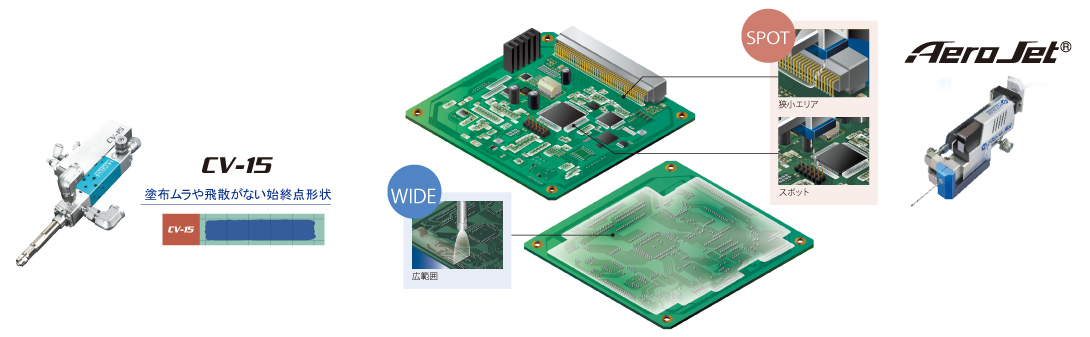 Puisque beaucoup de matériel de couche conformal a les caractéristiques d'isolation et est colorié, il ne pourrait pas devoir l'attacher aux parties de mise en œuvre telles qu'une douille ou le système optique du connecteur. Nos appels de compagnie qu'ils appliquent un agent de couche de la quantité nécessaire pour le point nécessaire "la couche de tache" en évitant de telles parties. Quand je ne peux pas exécuter la couche de tache, je la masque à l'avance pour un domaine de prohibition d'application et il y a la méthode pour s'appliquer à la surface entière ensuite. Cependant, une tâche a le démontage du masquage dans la productivité de masse parce que je suis fait manuellement.