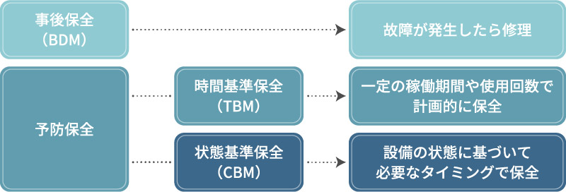 Pas seulement un distributeur, la technique de l'entretien d'équipement important se développe de l'entretien ultérieur (BDM) à l'entretien préventif (TBM, CBM) dans l'appareil de production et partez pour l'entretien de prévoyance futur (PdM). Je compare le mérite avec chaque caractéristique et cet article introduira notre produit inquiété.C'est - la technique d'entretien la plus fondamentale avec l'entretien ultérieur (BDM)