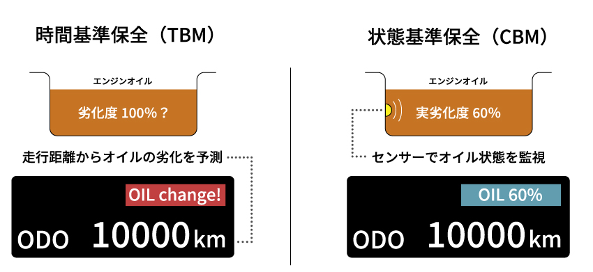 Par exemple, il est populaire d'exécuter l'échange du pétrole de locomotive en jugeant régulièrement selon le kilométrage et la période de la voiture quand il cite une voiture comme un exemple. Quant à l'indication, il est difficile pour un conducteur de calculer le temps où l'échange est nécessaire exactement par la condition de conduite de la voiture d'être différent. Dans de dernières années pas seulement le kilométrage simple mais aussi le véhicule qui juge la fréquence du nombre de révolutions du moteur et de la course à court terme compositement et promeut l'échange du pétrole et la qualité de mesure de véhicule du pétrole est né directement et les renseignements que ces voitures fournissent la détérioration de juges du pétrole plus exactement et permettent l'entretien dans le chronométrage approprié.