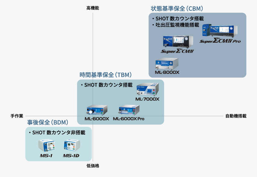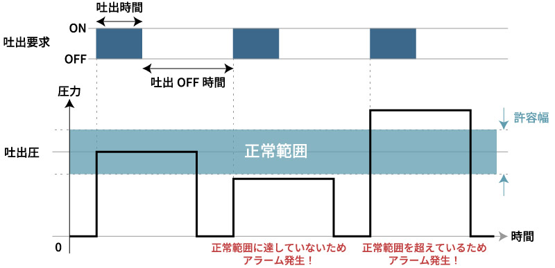 Parmi nos distributeurs de méthode de pouls aériens, le MILLILITRE-8000X et la série SuperΣCMIV sont équipés avec une "pression de renvoi contrôlant" la fonction comme un nouveau trait. De cette manière, chaque mouvement de renvoi, je peux le regarder si la pression pour venir d'un distributeur est selon le cadre. Sans parler de la façon comment utiliser pour savoir le chronométrage quand j'avais une anomalie dans un renvoi par l'alarme, j'ai mis la fréquence de l'alarme et de la mauvaise situation de déclenchement dans l'atelier du client ensemble et en analysant la corrélation, optimise un chronométrage de l'entretien et peux réduire le prix inutile.